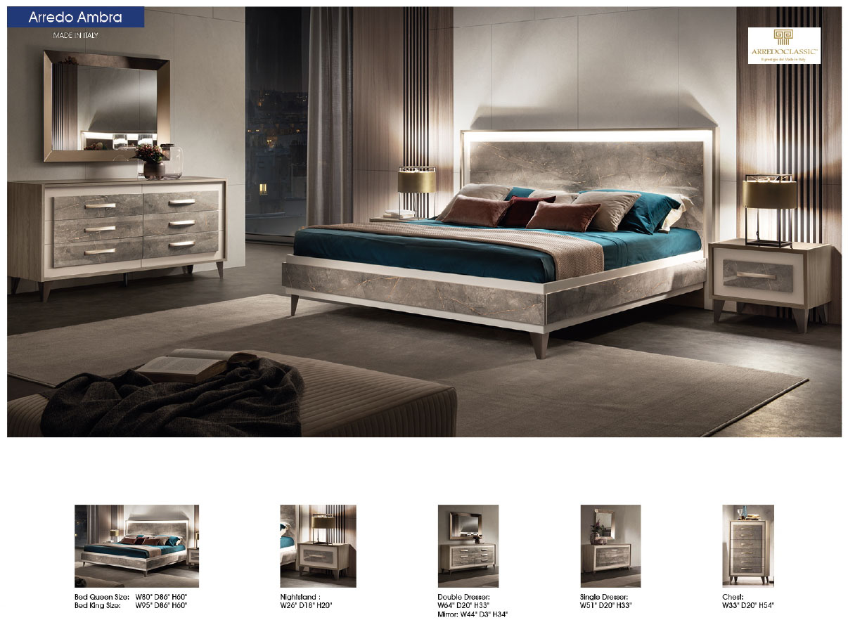 This elegant Italian bedroom set blends classic sophistication with contemporary comfort. The bed features a refined upholstered headboard framed by warm wood tones and marble-look accents, creating a calm and luxurious focal point. Coordinated nightstands and a double dresser offer balanced proportions, clean lines, and ample storage while maintaining a light, modern silhouette. A matching mirror enhances brightness and visual depth, completing a cohesive and serene bedroom atmosphere. Crafted in Italy, this set reflects Arredoclassic’s dedication to quality, timeless design, and everyday functionality.